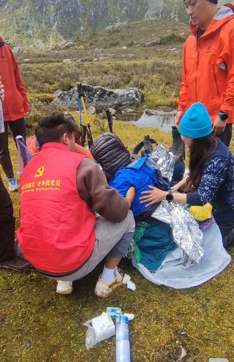 同伴拍摄的视频显示,在四人到来之前,已经有其他徒步的游客发现女孩,为女孩铺上隔热垫,盖上羽绒服、冲锋衣等。拉马加了解到,这群游客中,有两位医务人员,也有几名蓝天救援队队员。