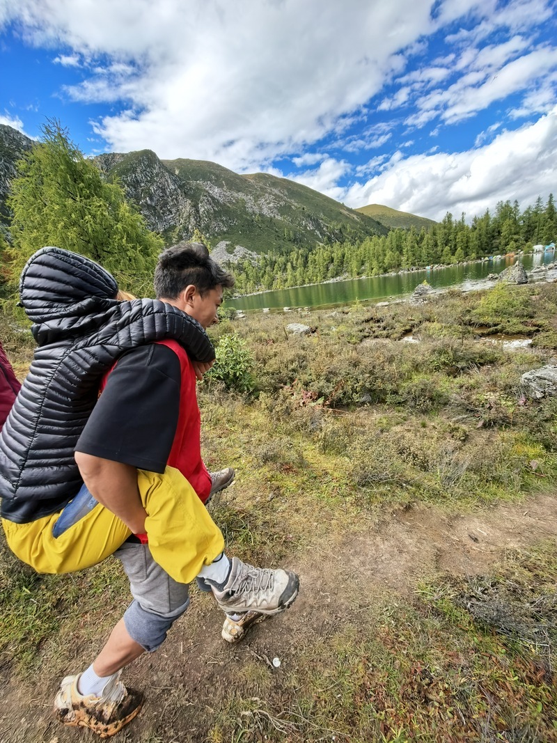 原本需要两个小时的路程,他们只用了一个小时左右到达。翻过垭口后,围在女孩身边的游客认出穿红马甲的拉马加是救援人员,向他们招手、呼喊。
